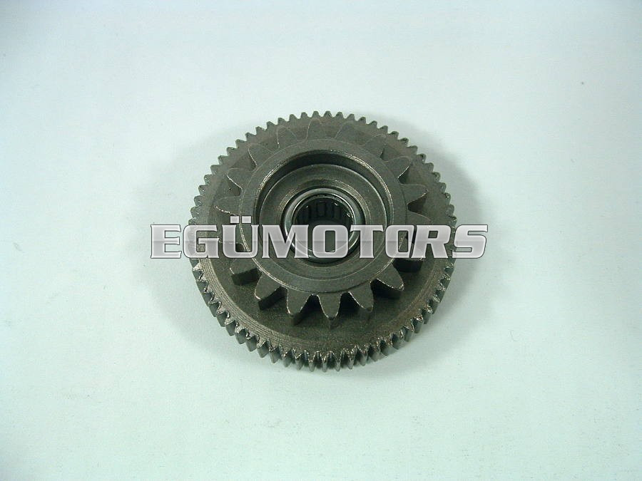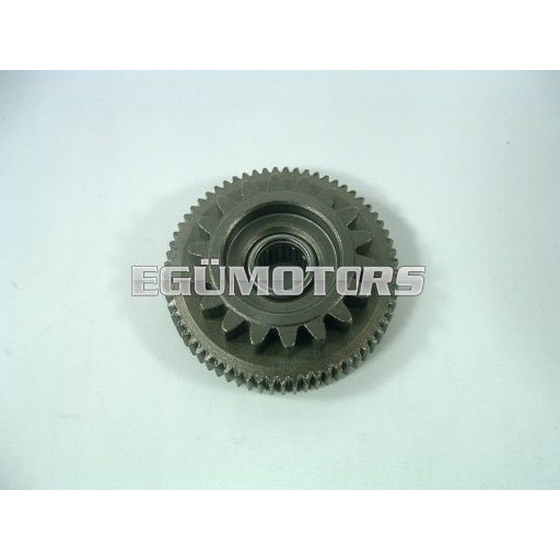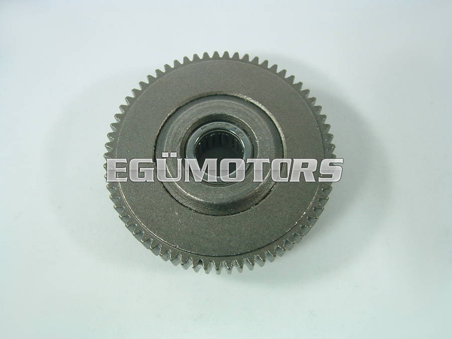Távolkeleti gyártmányú közlőfogaskerék az önindítóhoz, CY-CA-MY-MA blokkos robogókba való alkatrész. 6-os számú alkatrész a további képeknél látható robbantott ábrán. A belsejében tűgörgős csapágy található.