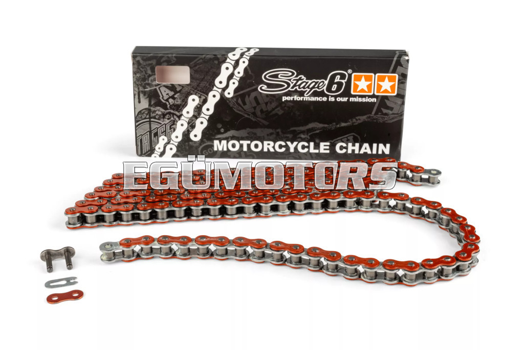 Kiváló minőségű Stage6 HQ (High Quality) motorkerékpár lánc. Többféle mutatós, feltűnő színben kapható, optikai tuningnak is kitűnő!